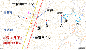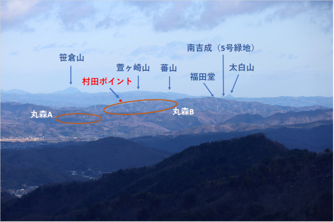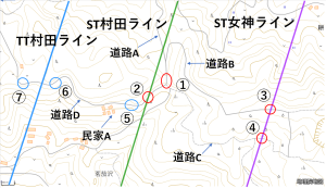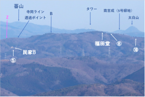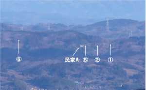 | 拡大写真1: 丸森エリアA ・道路Dのガードレールが見える。丸数字は、右図の確認ポイントの番号の場所。(以下同様) ・民家Aまで、距離22.9Km。 ・ちなみに6月運用記のポイント⑤の写真には、こちら側(女神山から一貫森)が写っています。 |